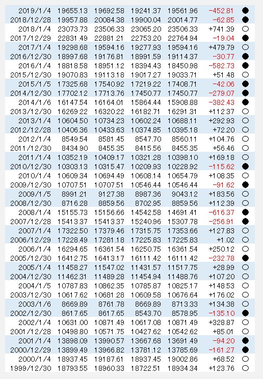 ●●は4年ぶり おそらく2000年代前半位までは一日商い(ご祝儀)的な風習もあり特に成績が良い 市場が段々盆も正月もない外国人に牛耳られるにつれてアノマリー的なものも失われた pic.twitter.com/CoOuziggTL— マキにゃん(19) (@100000_metal) 2019年1月4日