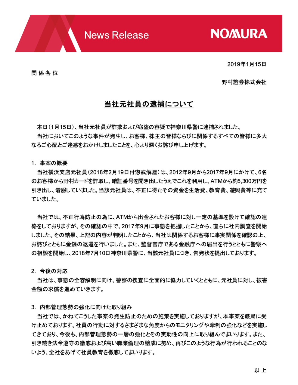 2019/01/15 野村證券 当社元社員の逮捕について