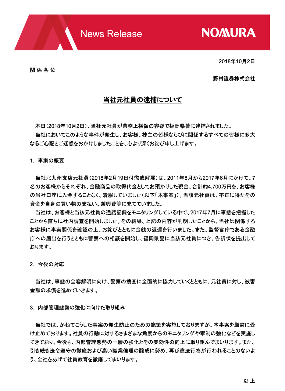 2018/10/02 野村證券 当社元社員の逮捕について