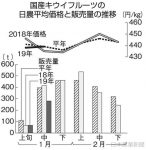 国産キウイフルーツの出始めの取引が苦戦している。小玉傾向などで、1月中旬の販売量は前年より3割少ないが、日農平均価格(各地区大手7卸のデータを集計)は1キロ439円と前年並みにとどまった。ニュージーランド(NZ)産を中心に輸入物の在庫が潤沢で、国産の販売に水を差している。