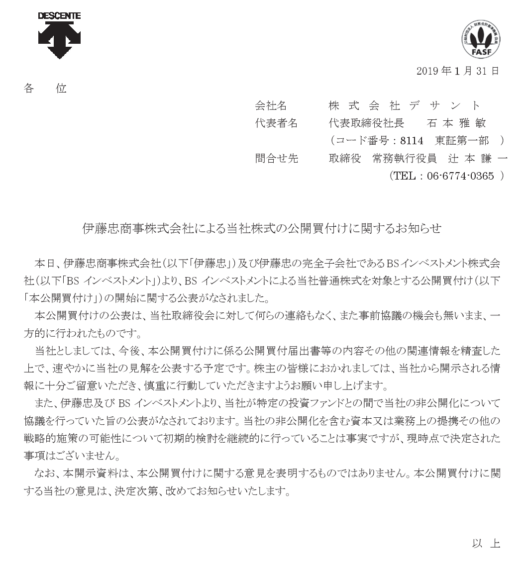 株式会社デサント株式(証券コード:8114)に対する公開買付けの開始に関するお知らせ