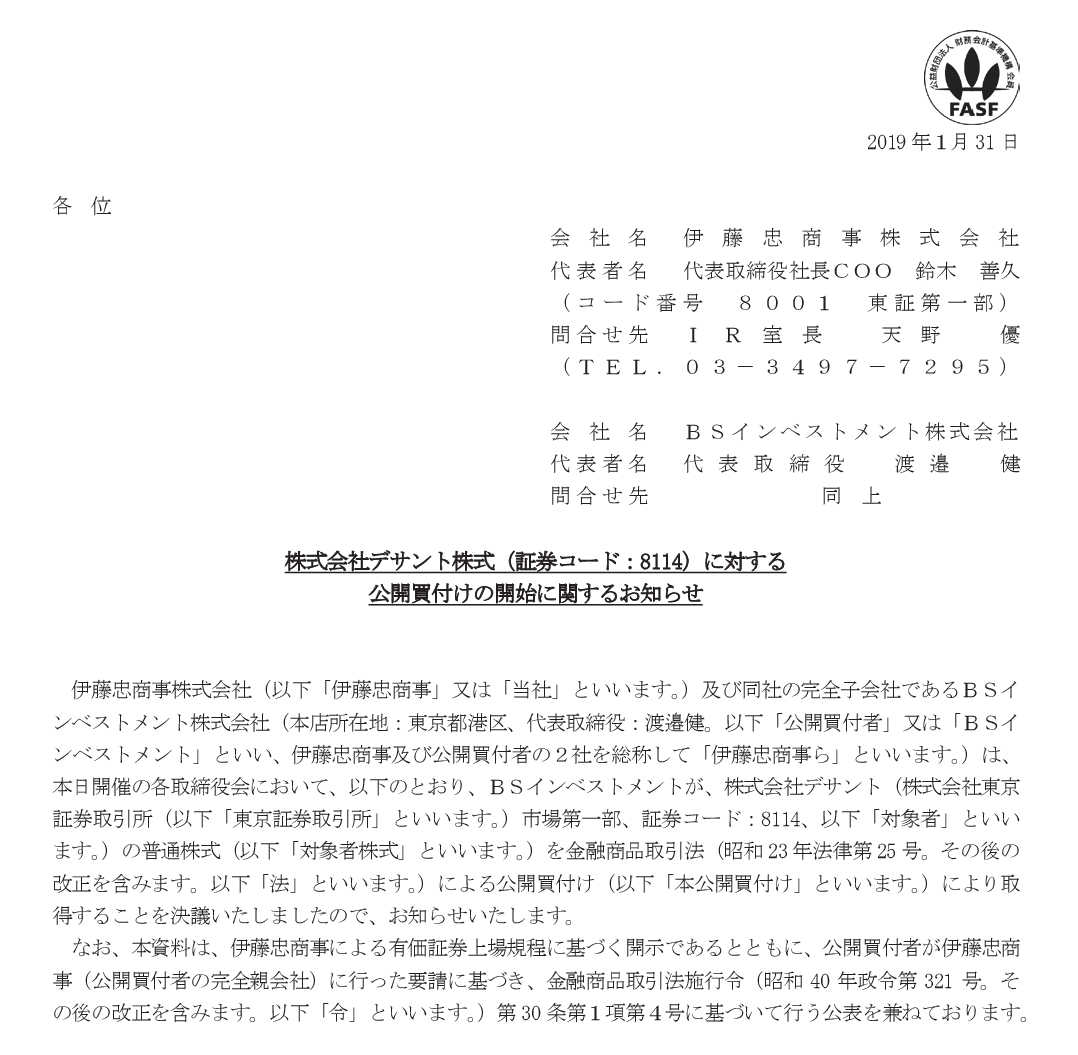 しかし世の中何があるか分からない 買付期間中に伊藤忠商事からの工作が奏功して結局デサント取締役会は賛同表明を出し、結果的に友好ベースに変化するかも知れない