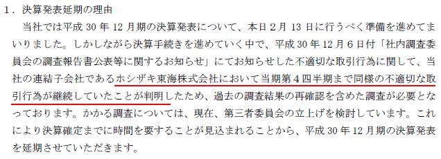 ・しかし、第4四半期(2018年10月から12月末)までホシザキ東海の不適切な取引行為の継続していたことが判明(上場廃止の回避時より更に期間拡大)