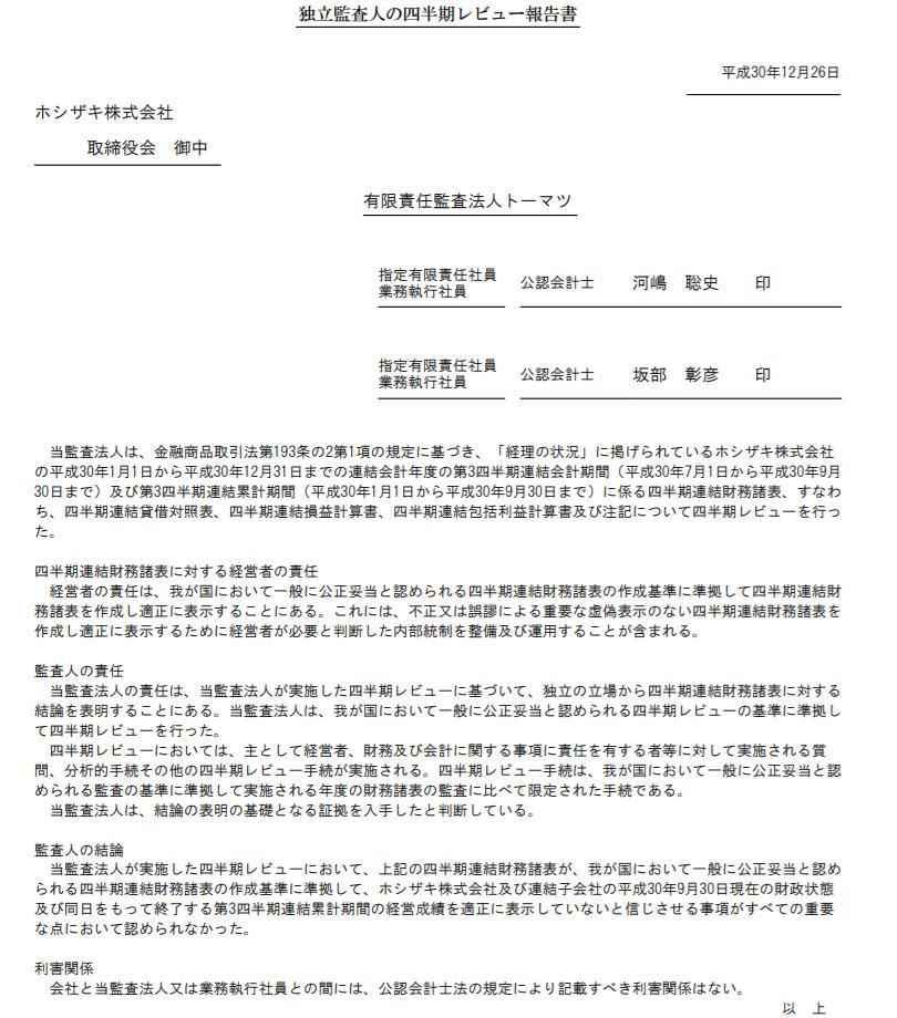 ホシザキ、これやったら前の3Q有報提出できずに上場廃止やったやろ