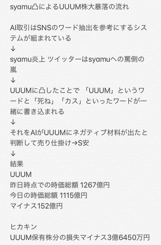 今回の騒動絡みでのUUUM株暴落についてこんな感じらしいですね