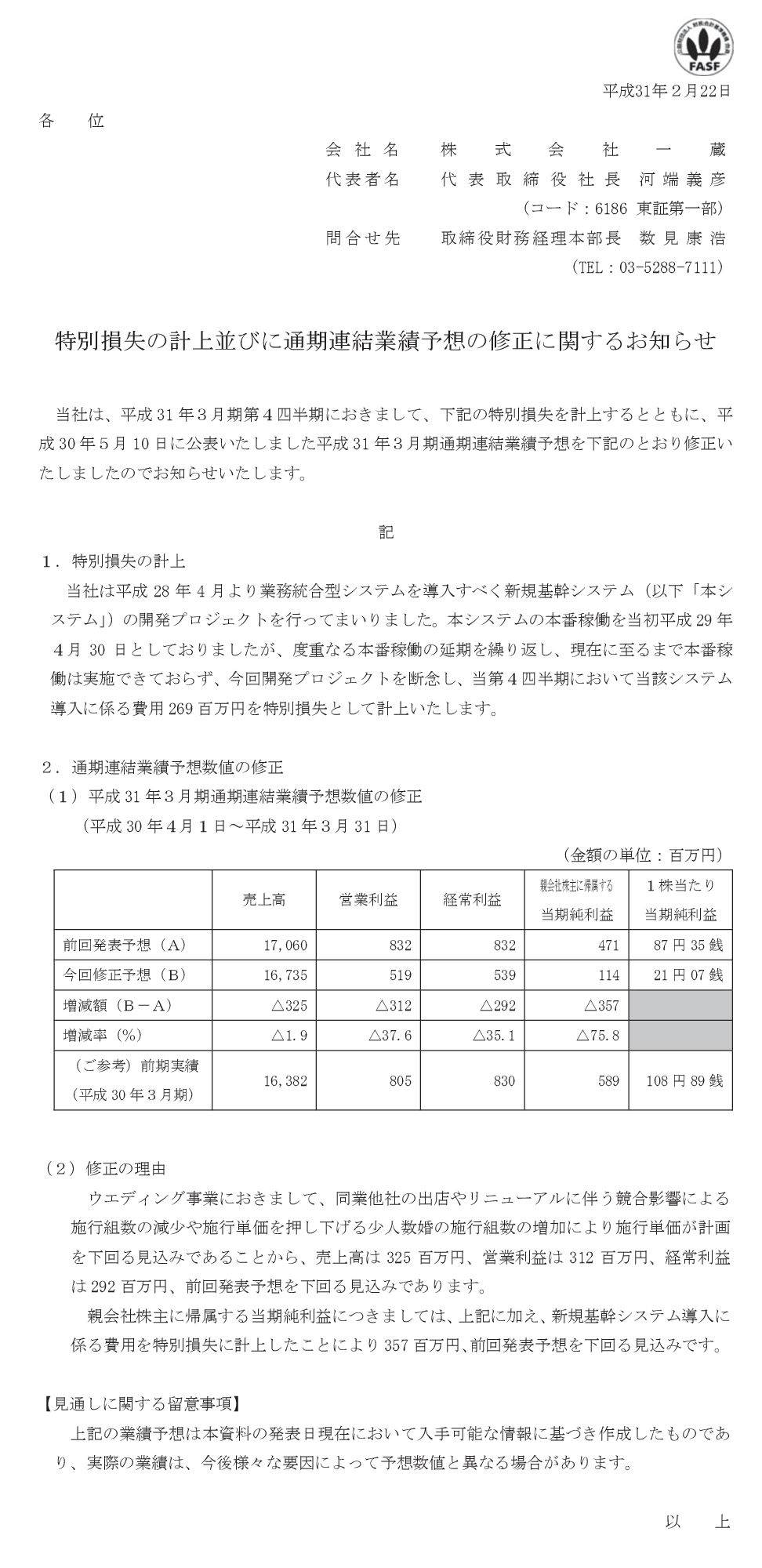 2019/02/22 15:40 一蔵 特別損失の計上並びに通期連結業績予想の修正に関するお知らせ