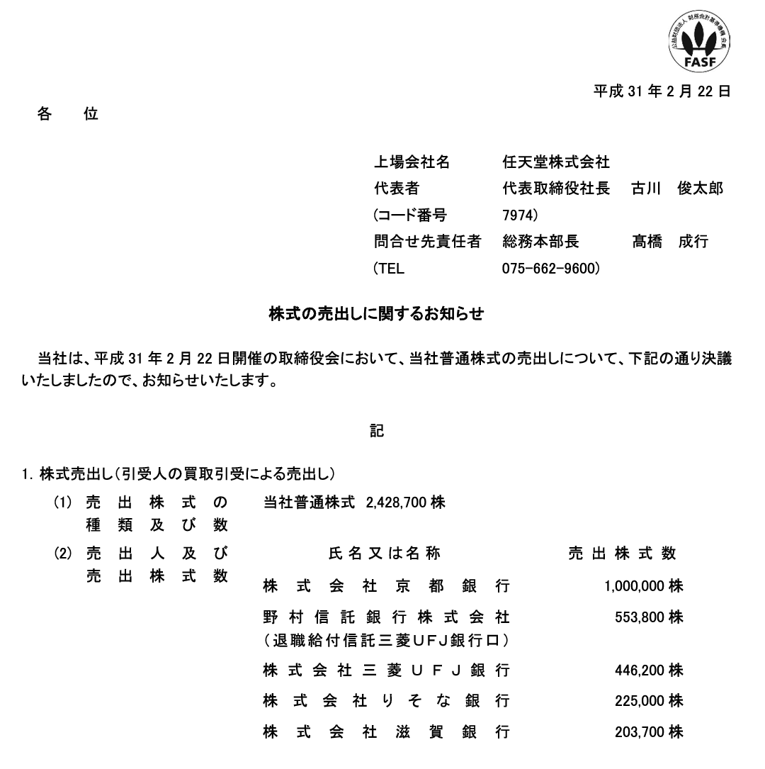 2019/02/22 16:00 任天堂 株式の売出しに関するお知らせ