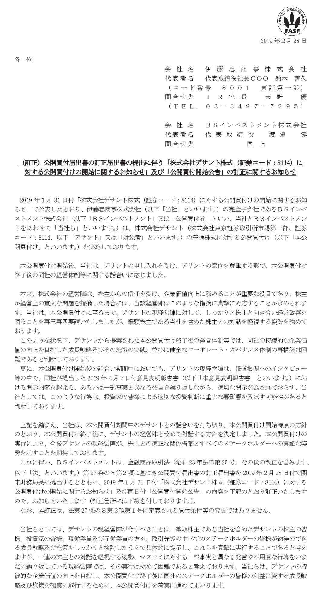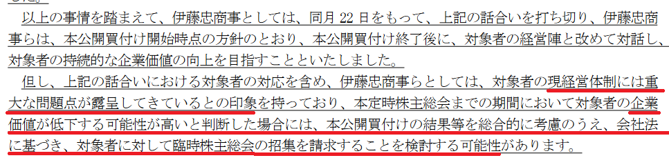 伊藤忠「デサントや石本社長がメディアを通じてオレを批判してるじゃーねか。言ってる事、信憑性どうなんだよ。22日から話し合いを打ち切った。TOB終了後に再度話すわ。TOB後場合により臨時株主総会の招集請求するからな。分かったか」