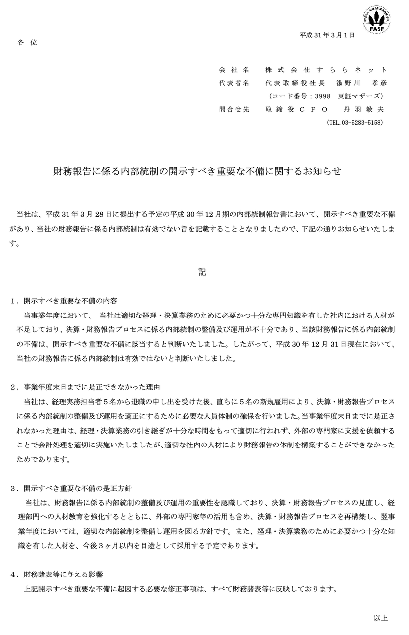 財務報告に係る内部統制の開示すべき重要な不備に関するお知らせ