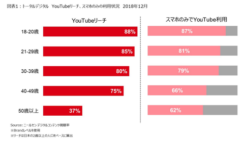 特に、30歳以下の利用率は80%を超え、YouTubeが人口の大半にリーチできるマスメディアへと成長していることが浮き彫りとなった。また、若い人ほどスマートフォンのみで動画を視聴する割合が高く、YouTubeを利用する18~20歳のうち87%はスマートフォンのみで動画を視聴していることも明らかになった。
