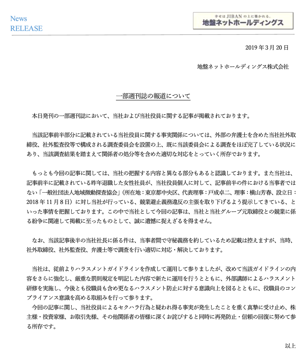 2019/03/20 地盤ネットホールディングス 一部週刊誌の報道について