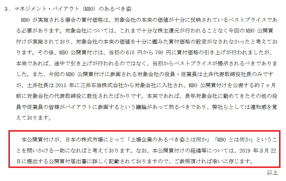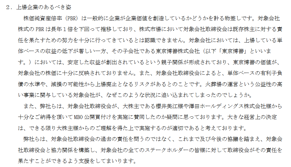 「今の株主に株主価値を調べる機会与えてないやろ。DDもできんわ。あんたとは7回協議したで。で750円でTOBするわ。あんたからの賛同まだないけど、どうなんや。PBR1より下やし子会社の葬儀屋の価値が反映されとらんやろ。このTOBが日本市場にて上場企業どうあるべきか問われてるんや」