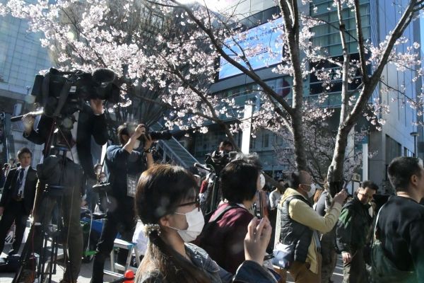 きょうは統一地方選挙の初日。自由党共同代表である山本議員の街宣には、多くの取材陣が詰めかけた。=21日、新宿駅南口