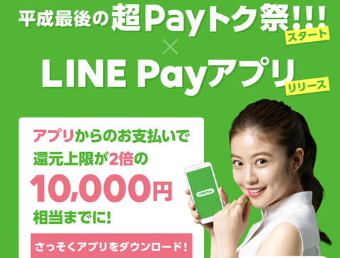 LINE Payは4月17日、最大20%還元キャンペーン「平成最後の超Payトク祭」も発表した。還元上限は5000円だが、期間中に一回でもLINE Payアプリでお買い物いただくと、最大10000円分が還元される。期間は4月18日から4月30日23時59分までの13日間。