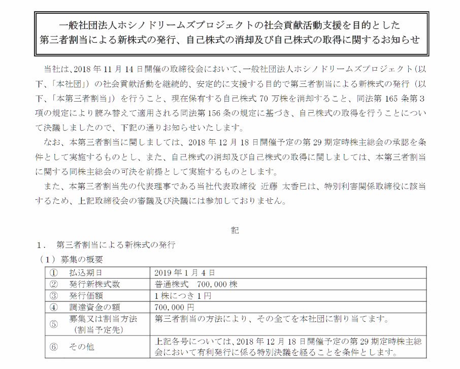 当時1850円ネクシィーズ、1円*70万株の株券印刷、希薄化を避けるために自己株70万償却、社会貢献活動支援の目的。近藤社長のポケットマネーor自身保有分を売り出して財源にすべき pic.twitter.com/YloclrSrSk— じろ(26) (@26ooo) 2019年4月25日