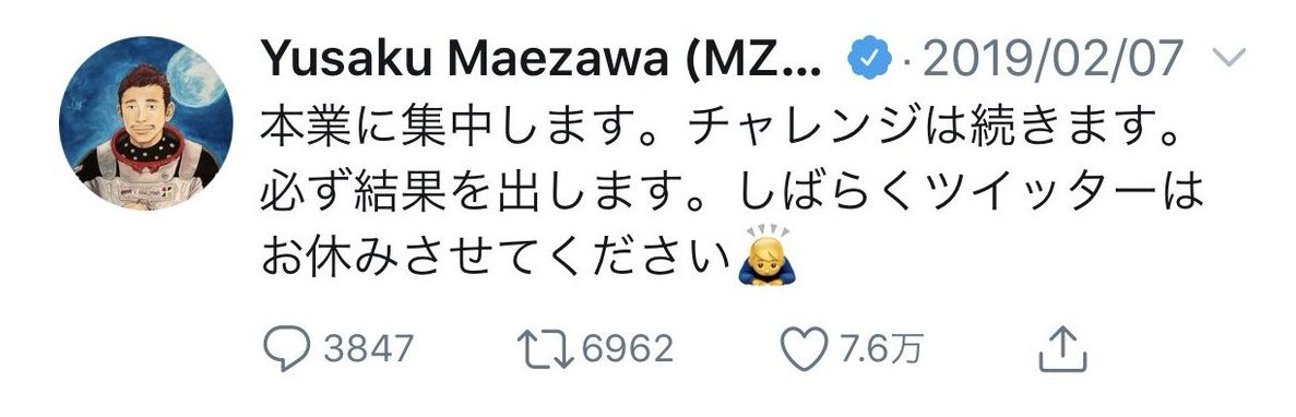 前澤氏はなんのために再開したのだろうか。やめたときは、本業に集中して結果出す、だったから、再開はその逆で、本業に集中しない結果出さない、ってことか??