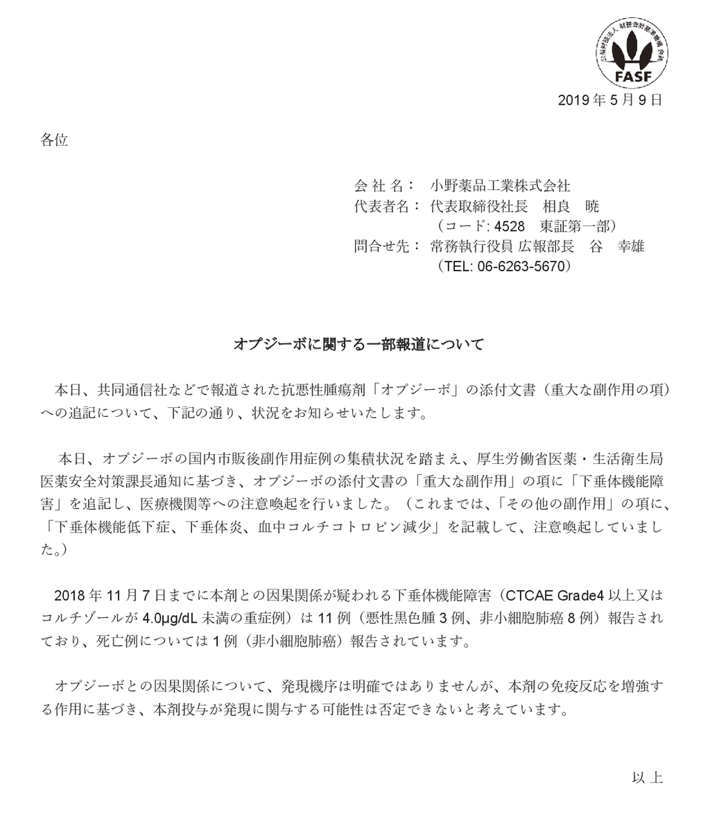 2019/05/09 18:30 小野薬品工業 オプジーボに関する一部報道についてhttps://www.ono.co.jp/jpnw/news/index.html