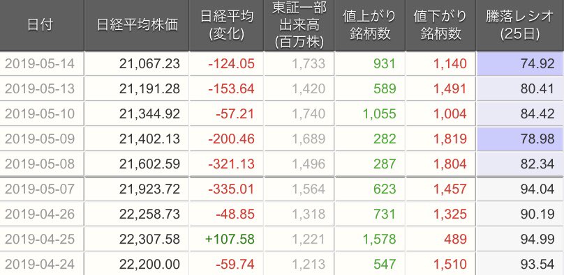 もう少しで東証1部25日騰落レシオが60台に。7営業日連続の下落で、日経平均は1240円ダウン。 pic.twitter.com/LDtkuWsX5d
