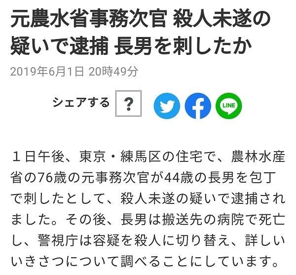 農水省の元事務次官に殺された息子、ニートで月30万以上おこずかいもらってて、母親に暴力ふるってて、ドラクエ10にログインしたまま死んだので、ゲーム内でみんなからキャラが罵倒されながらザオラルかけられてるとかいう凄まじすぎる状況