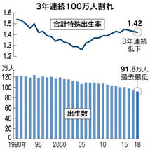 厚生労働省が7日に発表した人口動態統計によると、2018年に生まれた子どもの数(出生数)は91万8397人で過去最低を更新した。3年連続で100万人を割った。1人の女性が生涯に産む子どもの数にあたる合計特殊出生率は1.42と、17年から0.01ポイント下がった。低下は3年連続だ。晩産化や結婚をしない人が増えている影響が大きい。