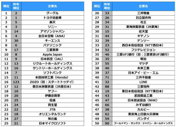 11~20位は、日本航空(JAL)、リクルートホールディングス、サントリーホールディングス、ソフトバンク、本田技研工業(ホンダ)、ZOZO、東日本旅客鉄道(JR東日本)、ヤフー、伊藤忠商事、電通が入った。