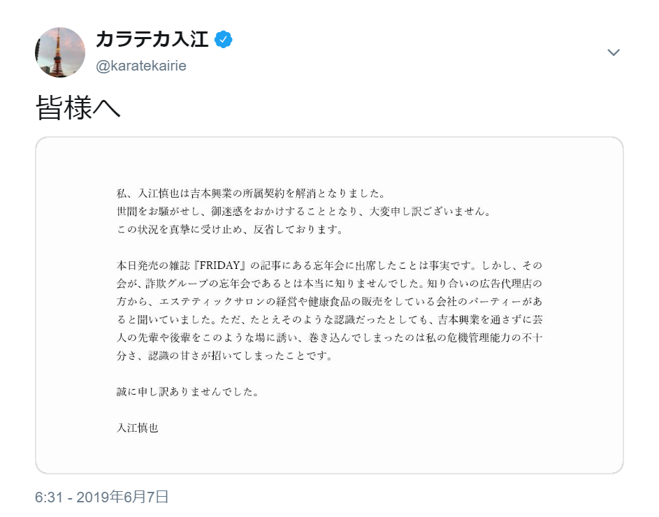 — 宮迫 (@motohage) 2019年6月7日