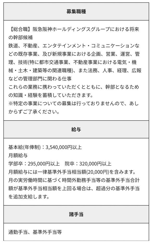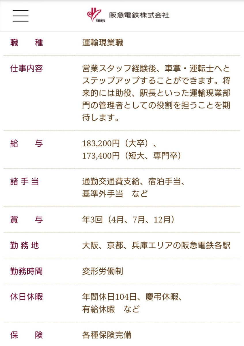 採用情報を見ると大卒で月18万3200円(短大・専門卒は17万3400円)なので、阪急電鉄さんの場合は「どちらでもない」が正解のようだ。 pic.twitter.com/4XCLTIo3ga