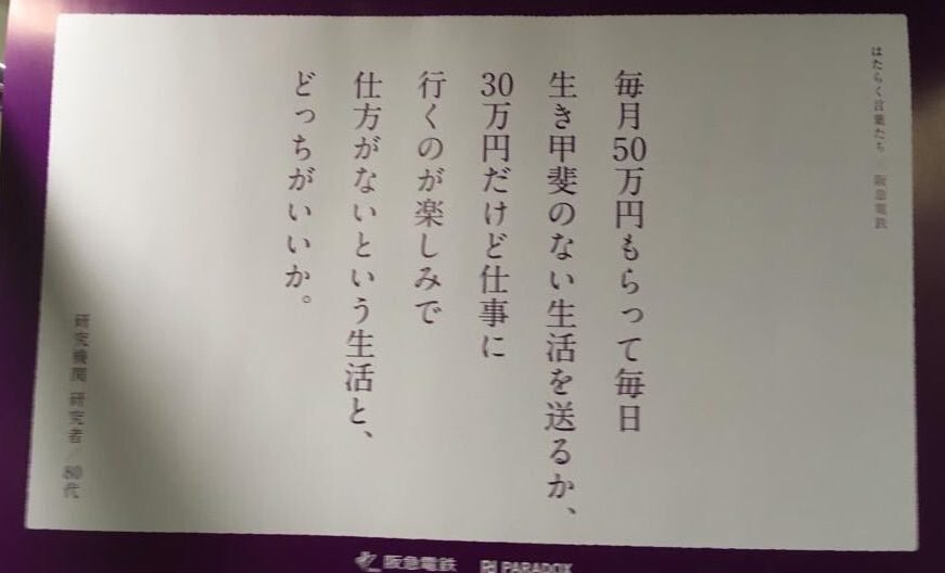 「月50万で生き甲斐のない生活か、月30万だけど仕事に行くのが楽しみで仕方がない生活とどちらが良いか」と言っている阪急電鉄さん。