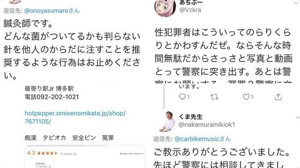 鍼師「痴漢に安全ピン、感染症の危険」 フェミ「こいつ痴漢推奨魔だ!この鍼院では性犯罪をしてまーす!」→偽計業務妨害で逮捕か