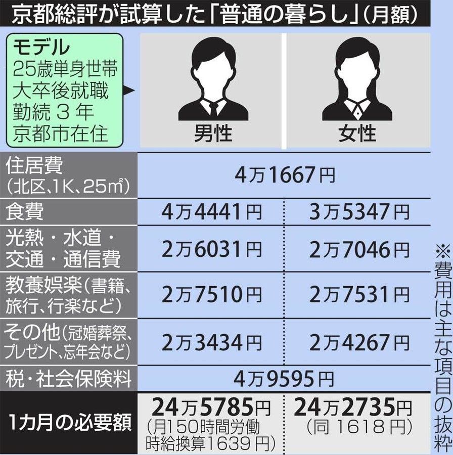 京都総評が加盟労働組合の組合員を対象にこのほど実施した生活実態調査によると、「普通の暮らし」の必要額の試算は、京都市在住の25歳単身者との想定で月額約24万円だった。月150時間労働で時給換算すると1600円超となり、京都総評は「現行の京都府の最低賃金882円は低すぎる」と分析している。