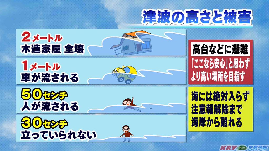 気象庁は、20cm~1mの津波が見込まれる時に「津波注意報」、1~3mの津波が見込まれる時に「津波警報」を発表します。注意報レベルでの津波でも、人が流されるパワーの可能性があるため、注意報等が出たら、絶対に海に入らないように。#津波 pic.twitter.com/pPcKZAYoNN