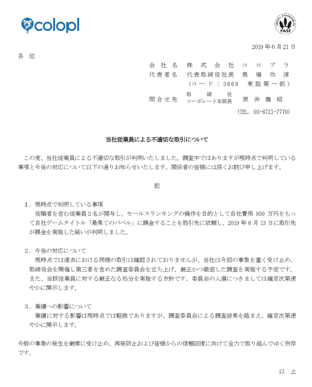2019/06/21 16:15 コロプラ 当社従業員による不適切な取引について
