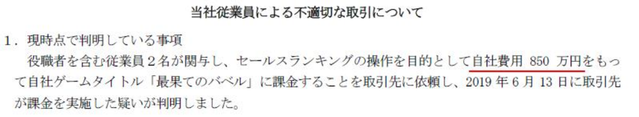 役職者を含む従業員2名が関与し、セールスランキングの操作を目的として自社費用850万円をもって自社ゲームタイトル「最果てのバベル」に課金することを取引先に依頼し、2019年6月13日に取引先が課金を実施した疑いが判明