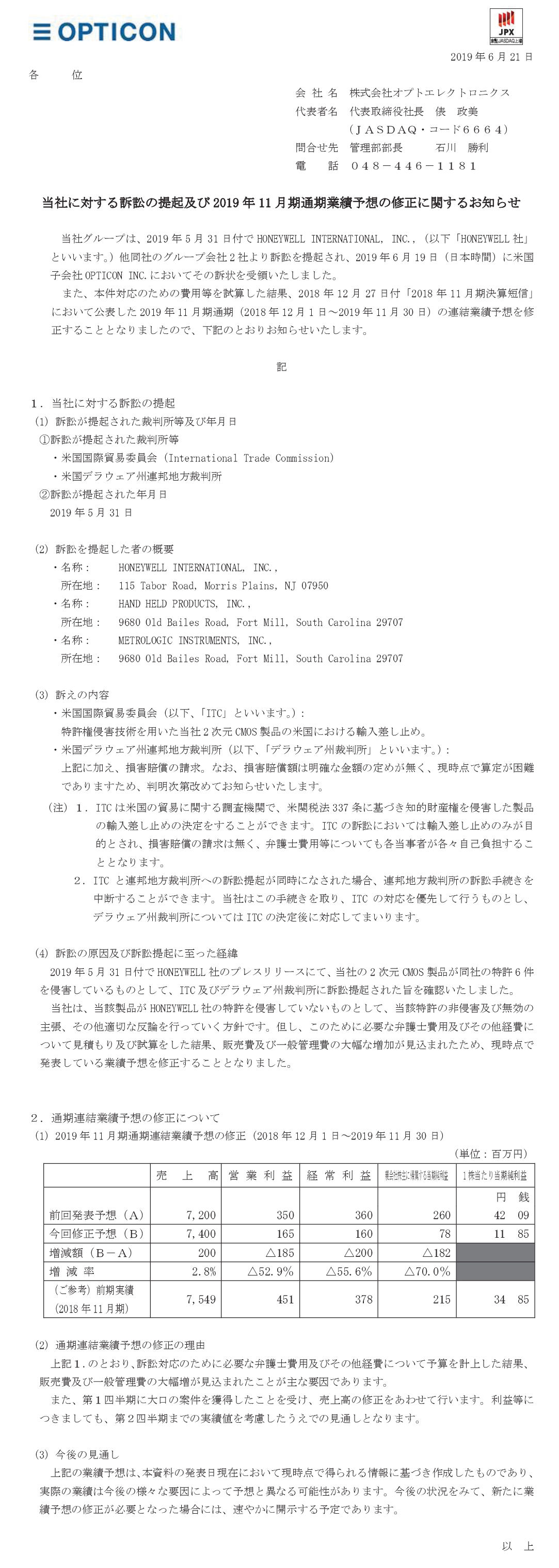 当社に対する訴訟の提起及び2019年11月期通期業績予想の修正に関するお知らせ