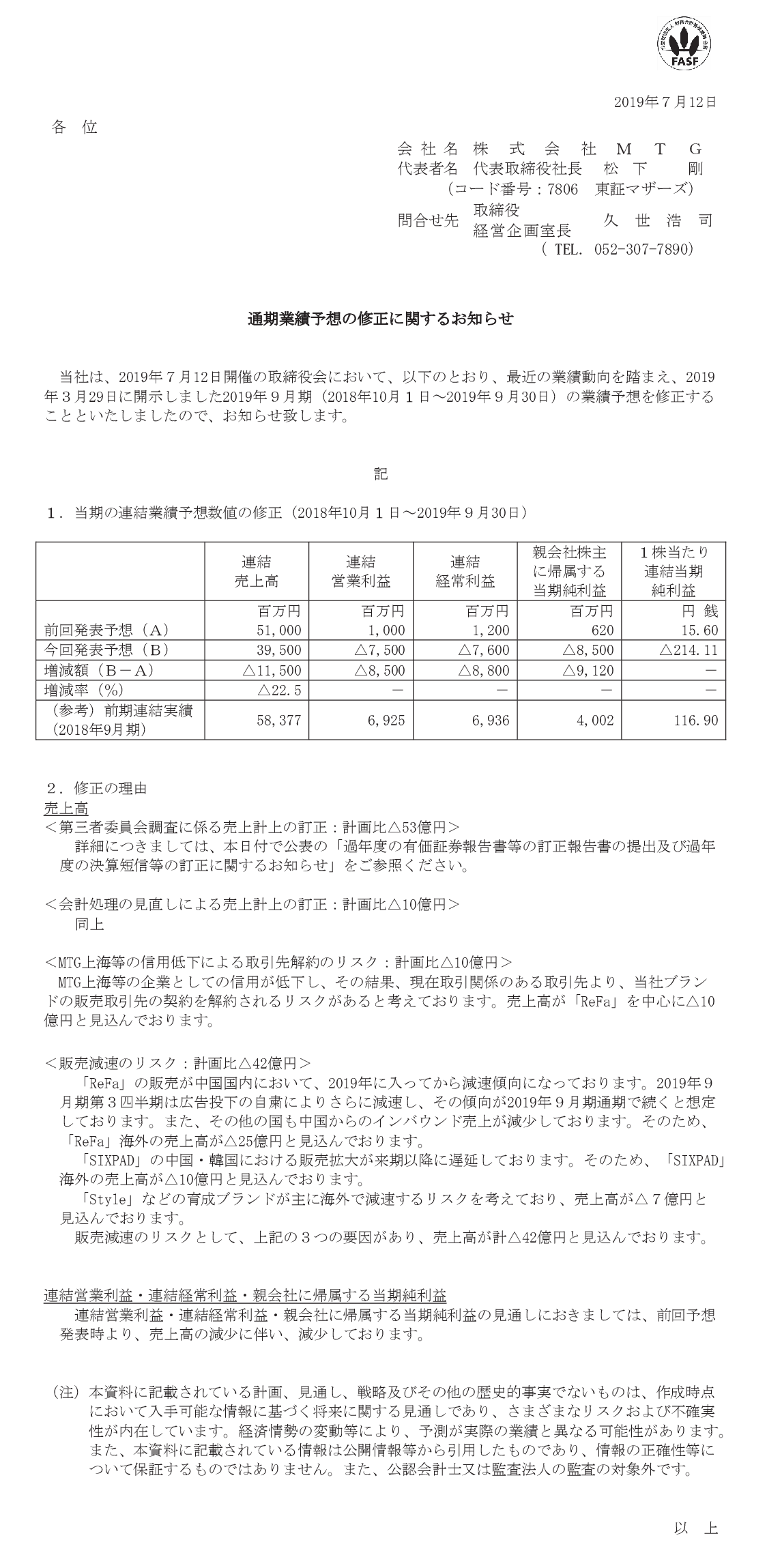 2019/07/12 18:30 MTG 通期業績予想の修正に関するお知らせ