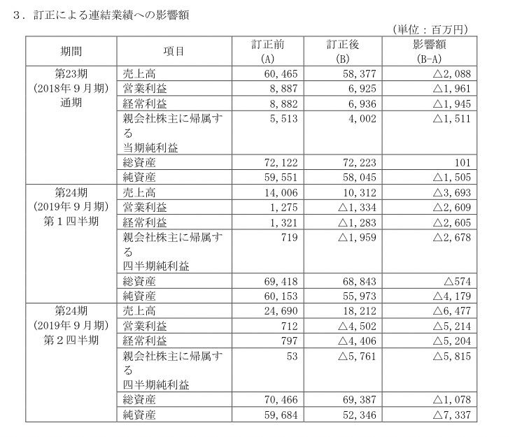 (2019年7月12日)MTG、18年9月期から19年1~3月期の決算を訂正 時価総額470億円←今ここ pic.twitter.com/5kzHHXST7U— 臨税太郎 (@nasu0301) 2019年7月12日