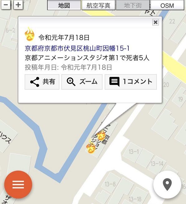 アニメ業界史上どころか犯罪史上でもまれに見る大惨事になってしまった…… 撒いたとされる液体が灯油じゃなくて容易に発火するガソリンなのは、犯人も死を覚悟してたのだろうか。