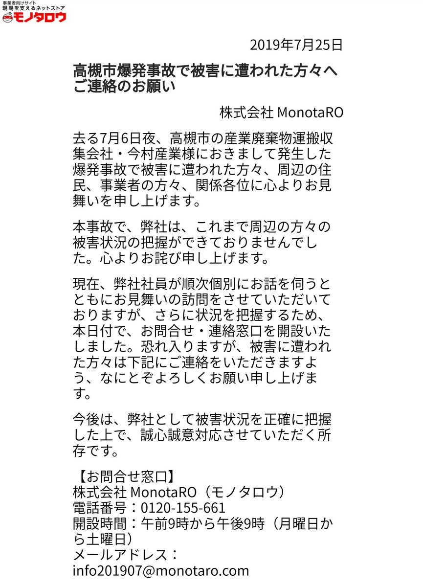 高槻市の倉庫爆発火災でモノタロウは2週間も謝罪に訪れていないとは…不信感しかないね。