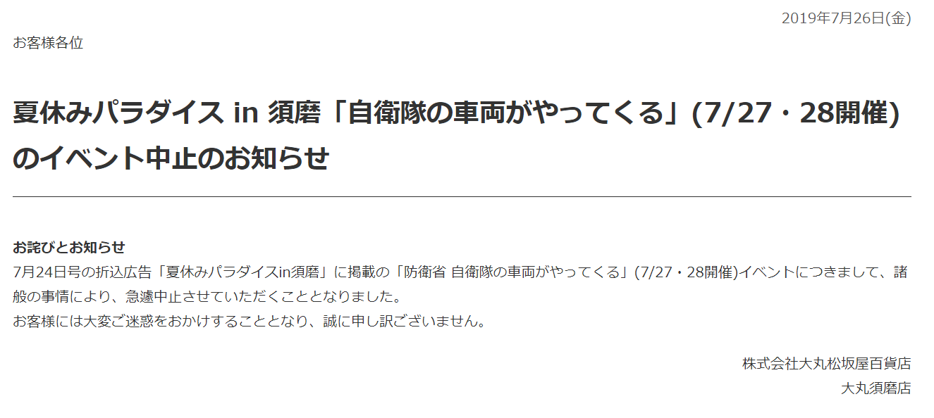 大丸松坂屋百貨店、共産党系政治団体の圧力で大丸須磨店の自衛隊イベントを急きょ中止
