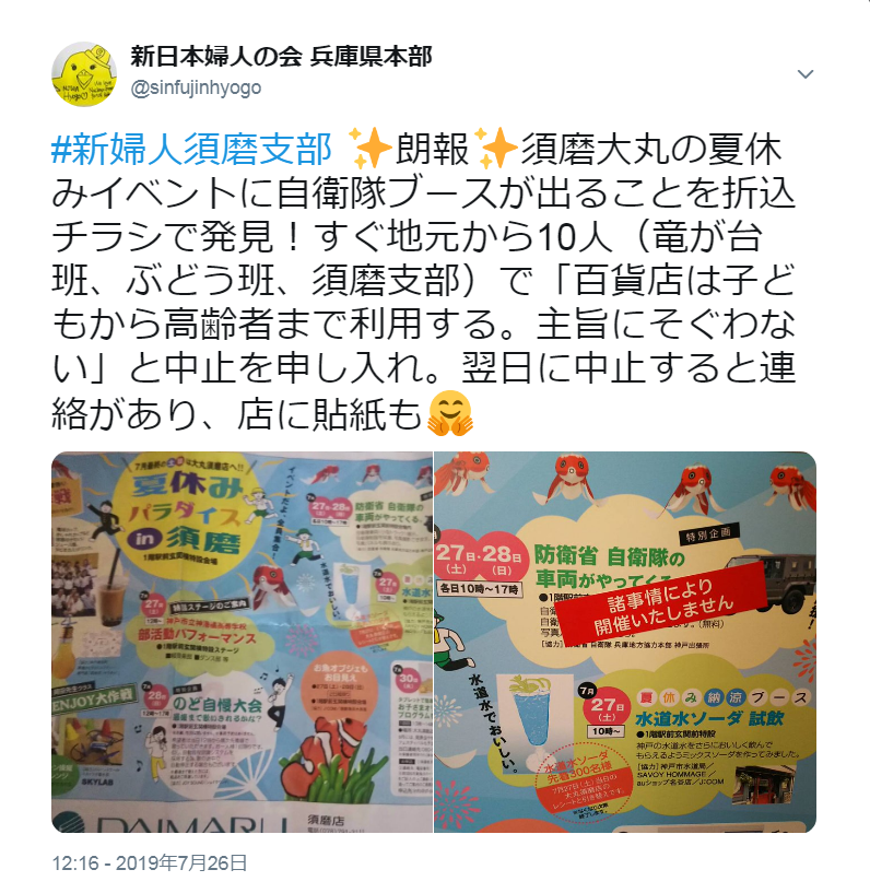 新日本婦人の会が須磨大丸に圧力をかけてイベントを中止させた件、日本共産党神戸市議も関係していた。須磨大丸に足を運んで、従業員と面談して団体の声を伝えた。団体との同行、中止要請は否定。 pic.twitter.com/szGgjbjvin
