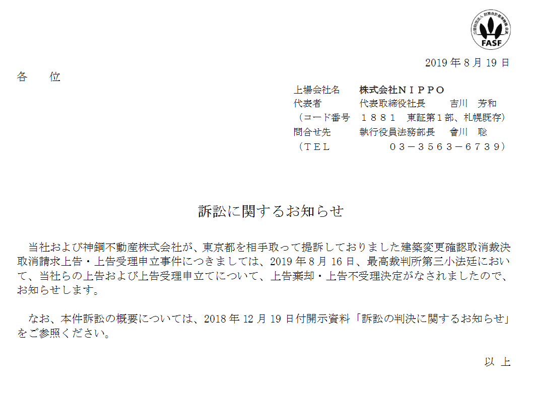 2019/08/19 17:00 NIPPO 訴訟に関するお知らせ