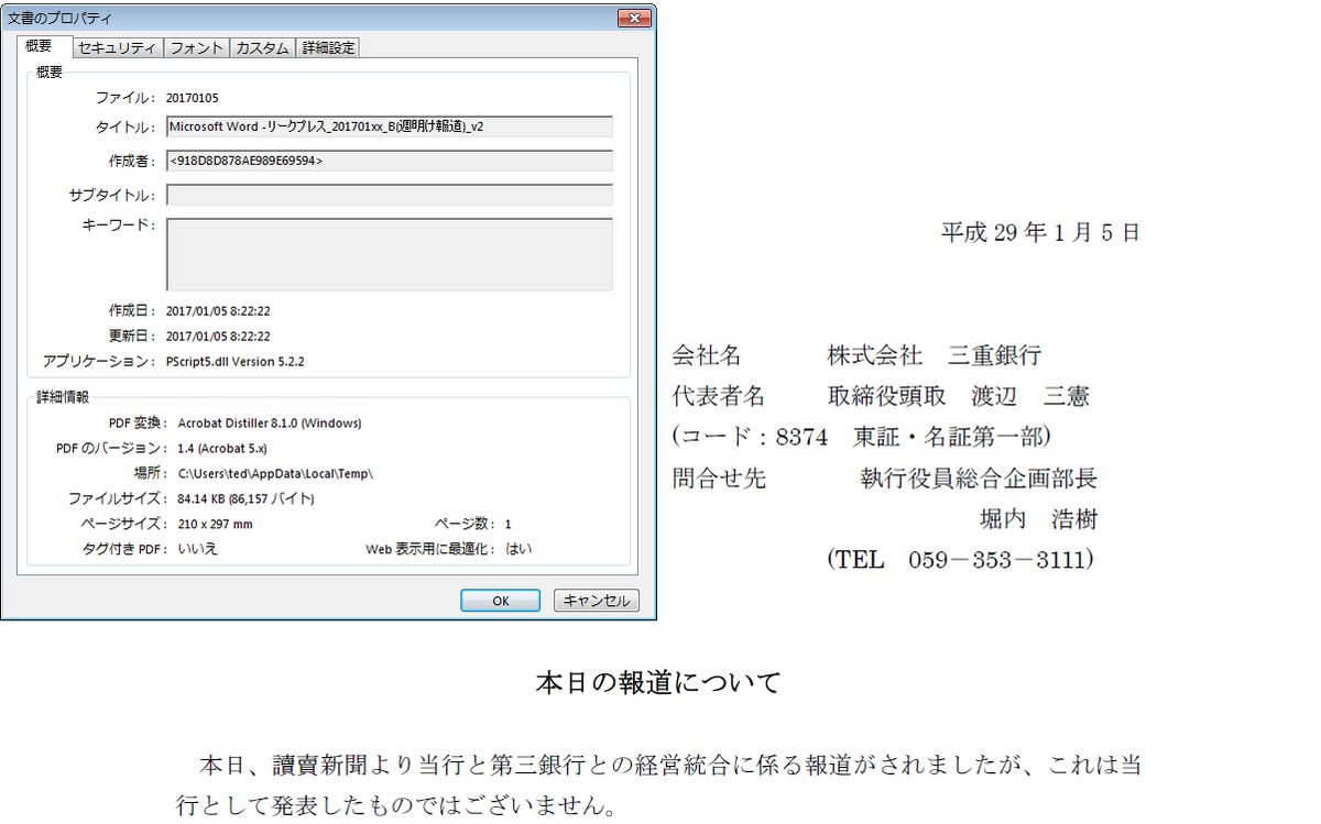 ※三重銀行「讀賣新聞より当行と第三銀行との経営統合に係る報道がされましたが、これは当行として発表したものではございません」(リークプレス 週明け報道)(2017/01/05)