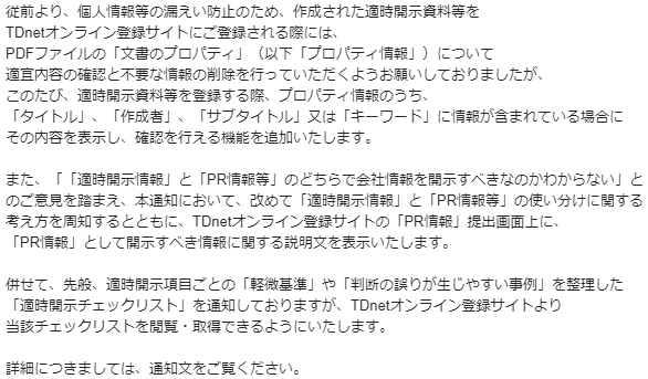 東証から上場企業にむけてこんなお便り PDFプロパティについてとか適時開示・PR情報の使い分けとか pic.twitter.com/7yZgOg4rUW