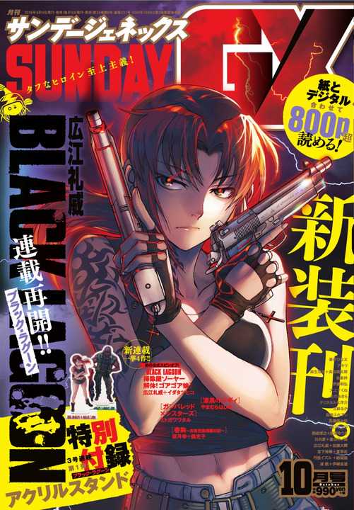 広江礼威さんの人気マンガ「BLACK LAGOON(ブラック・ラグーン)」が、9月19日発売の連載誌「サンデーGX(ジェネックス)」(小学館)10月号で約1年ぶりに連載を再開した。2018年8月18日発売の同誌9月号で「単行本作業のためしばらく休載します。なる早で戻ってきます!!」と発表していた。