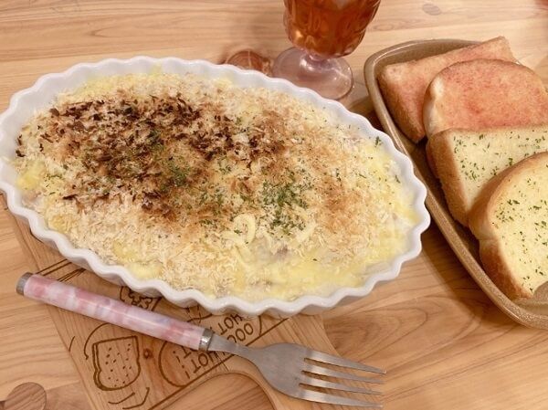 「チーズの上にパン粉をたっぷりかけてあるから、チーズが溶ける前に焦げちゃうんじゃない?チーズが溶けてないグラタン(笑)」