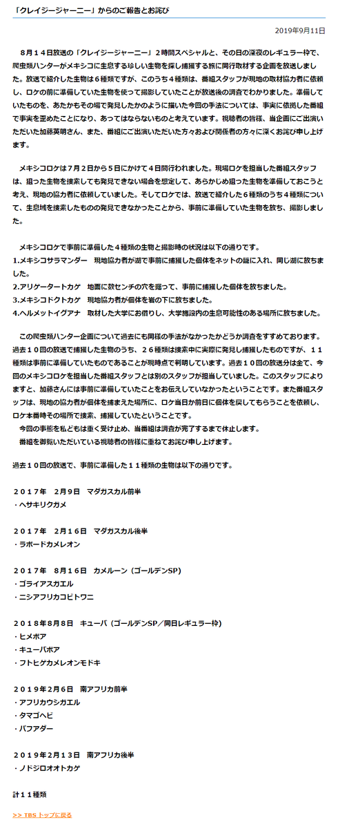 「クレイジージャーニー」からのご報告とお詫び|TBSテレビhttps://t.co/WI7LJjKNzq
