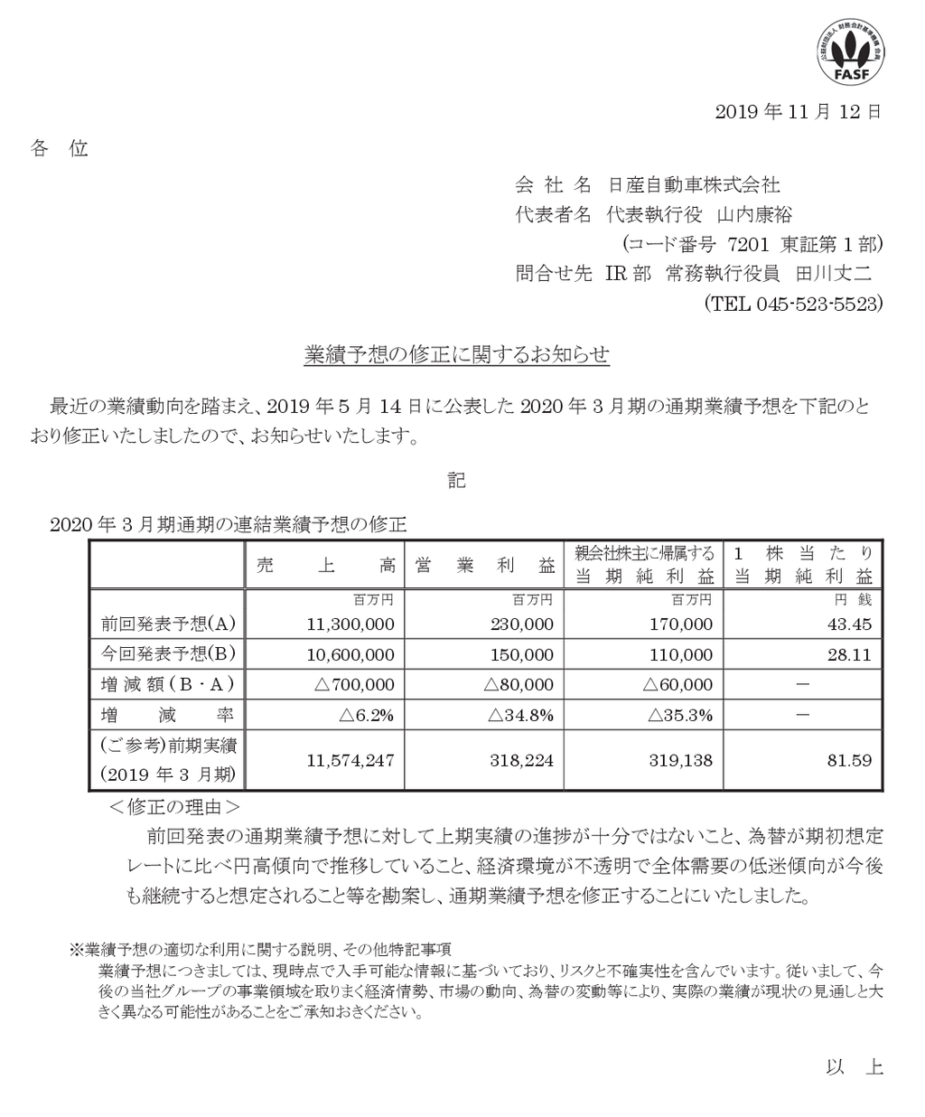 2019/11/12 17:00 日産自動車 業績予想の修正に関するお知らせ