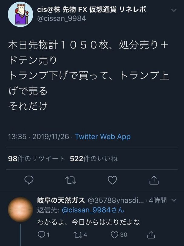 ⇒一人で日経平均もダウも先物も全て動かしちゃう男— オジサン@専業投資家ブログ (@kabuojisan28) 2019年11月1日