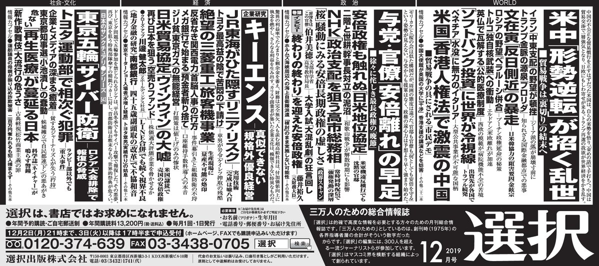 フリーダイヤル 0120-374-639 pic.twitter.com/imALOnO7WZ— 選択出版 (@SENTAKUmagazine) 2019年12月2日