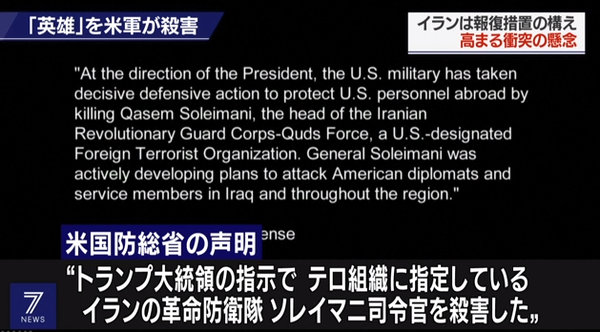 アメリカ国防総省はトランプ大統領の指示で、イランの精鋭部隊、革命防衛隊の司令官への攻撃を実施し、殺害したことを明らかにしました。イランの最高指導者は報復措置を取る考えを示しており、アメリカとイランの衝突につながることへの懸念が高まっています。